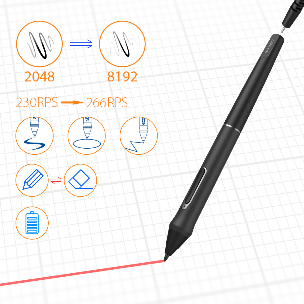 P02S – новое поколение перьев от XP-Pen, разработанное специально для графических дисплеев. Они способны работать без дополнительной зарядки до 60 дней, имеют по сравнению предыдущими поколениями увеличенную чувствительность нажатия до 8192 уровней и. P02S – удивительно эргономичные, удобны в использовании, а благодаря специальному прорезиненному покрытию не скользят в руке.